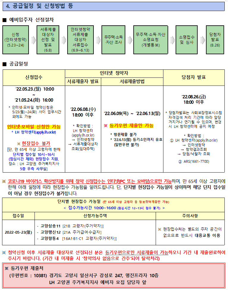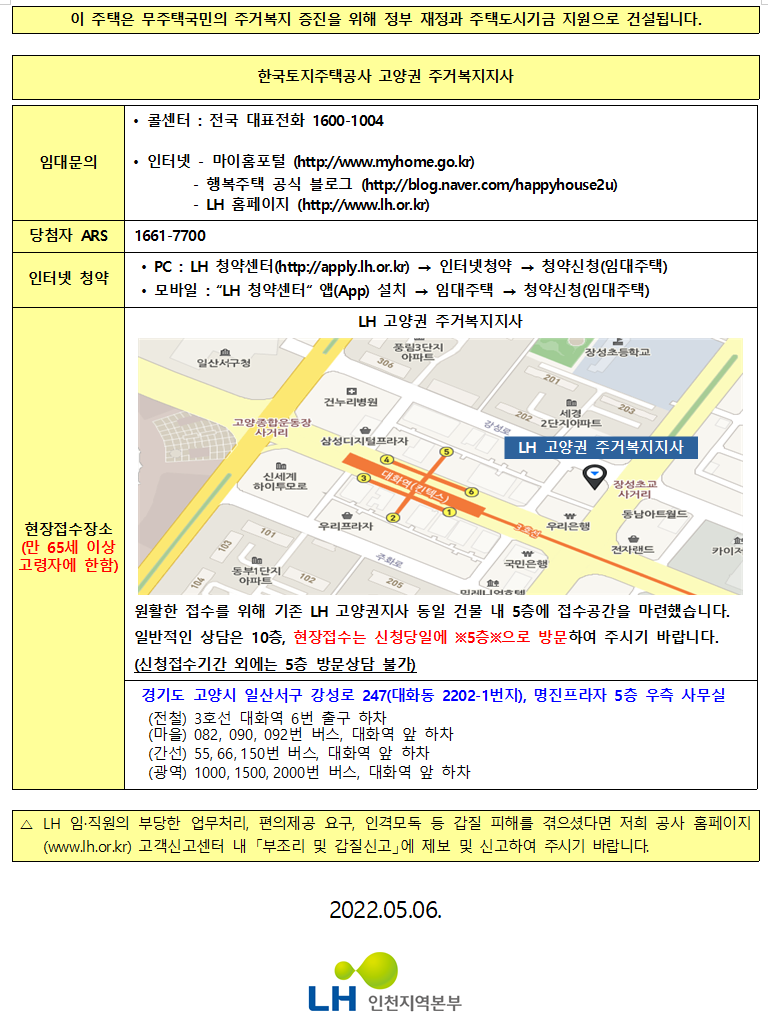 • 예비입주자에 대한 임대차계약 및 입주안내는 등기우편으로 통보해드리니, 당첨 후 주소 및 전화번호 변동이 있을 때에는 반드시 LH 고양권 주거복지지사에 서면으로 통보(등본발송등)하여야 합니다.