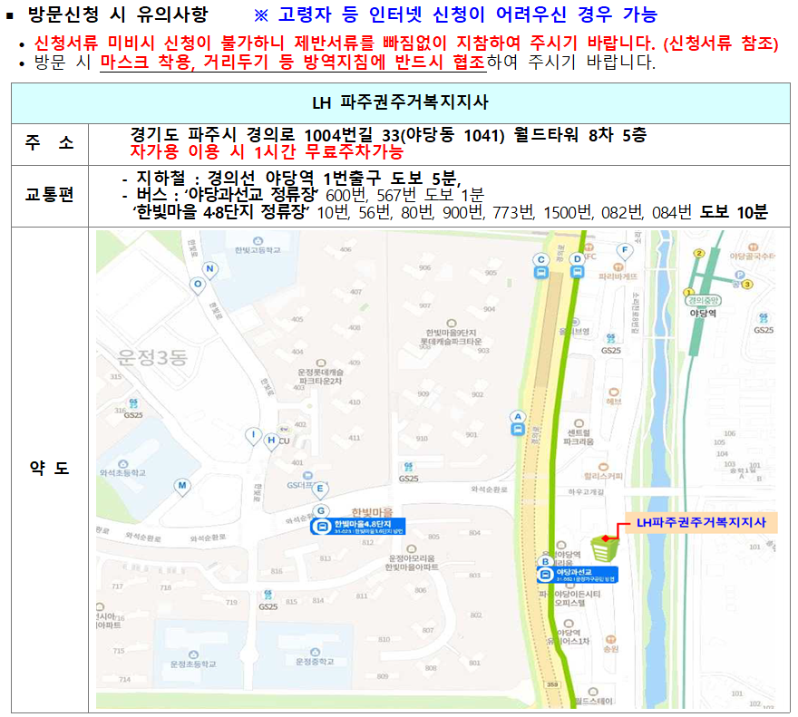 ** 서류제출처 : (10906) 경기도 파주시 경의로1004번길 33, 월드타워8차 6층 LH예비자담당