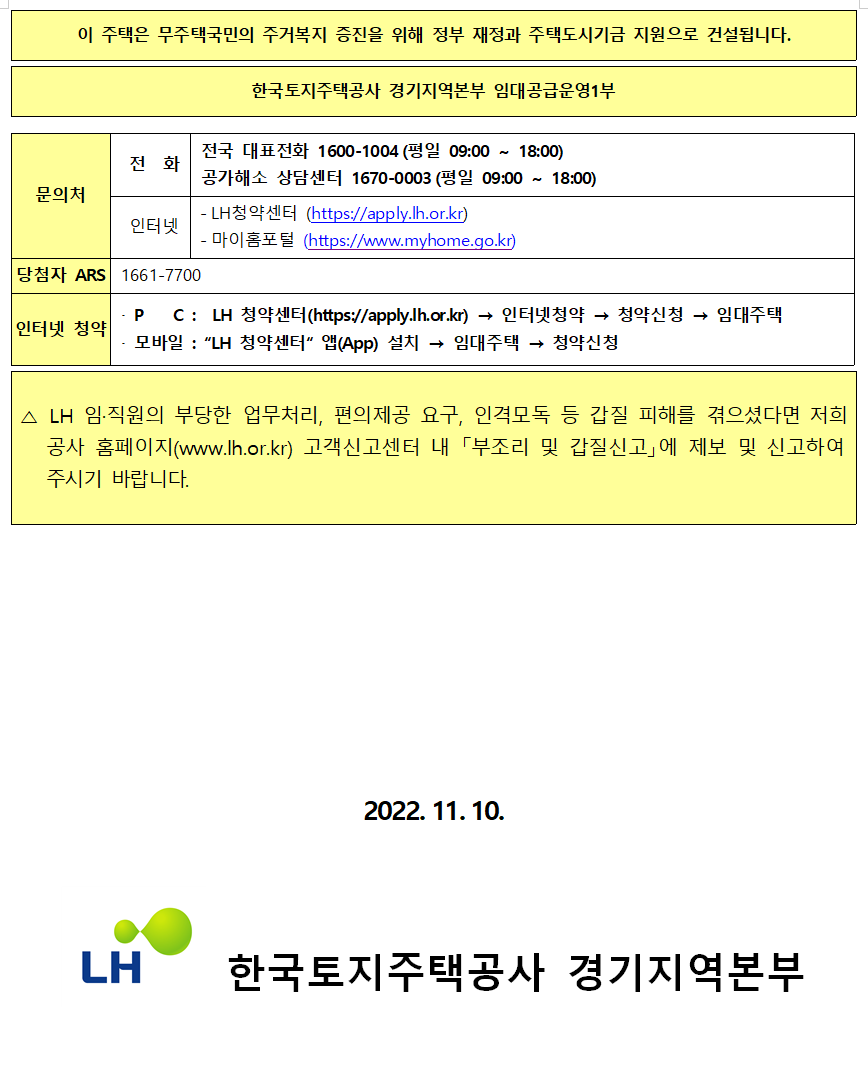• LH 청약센터(https://apply.lh.or.kr) 및 ARS(1661-7700)를 통해 당첨 발표일로부터 30일간 확인할 수 있으며, 당첨 사실을 확인하지 못하여 계약 체결을 못한 경우의 책임은 신청자 본인에게 있습니다.