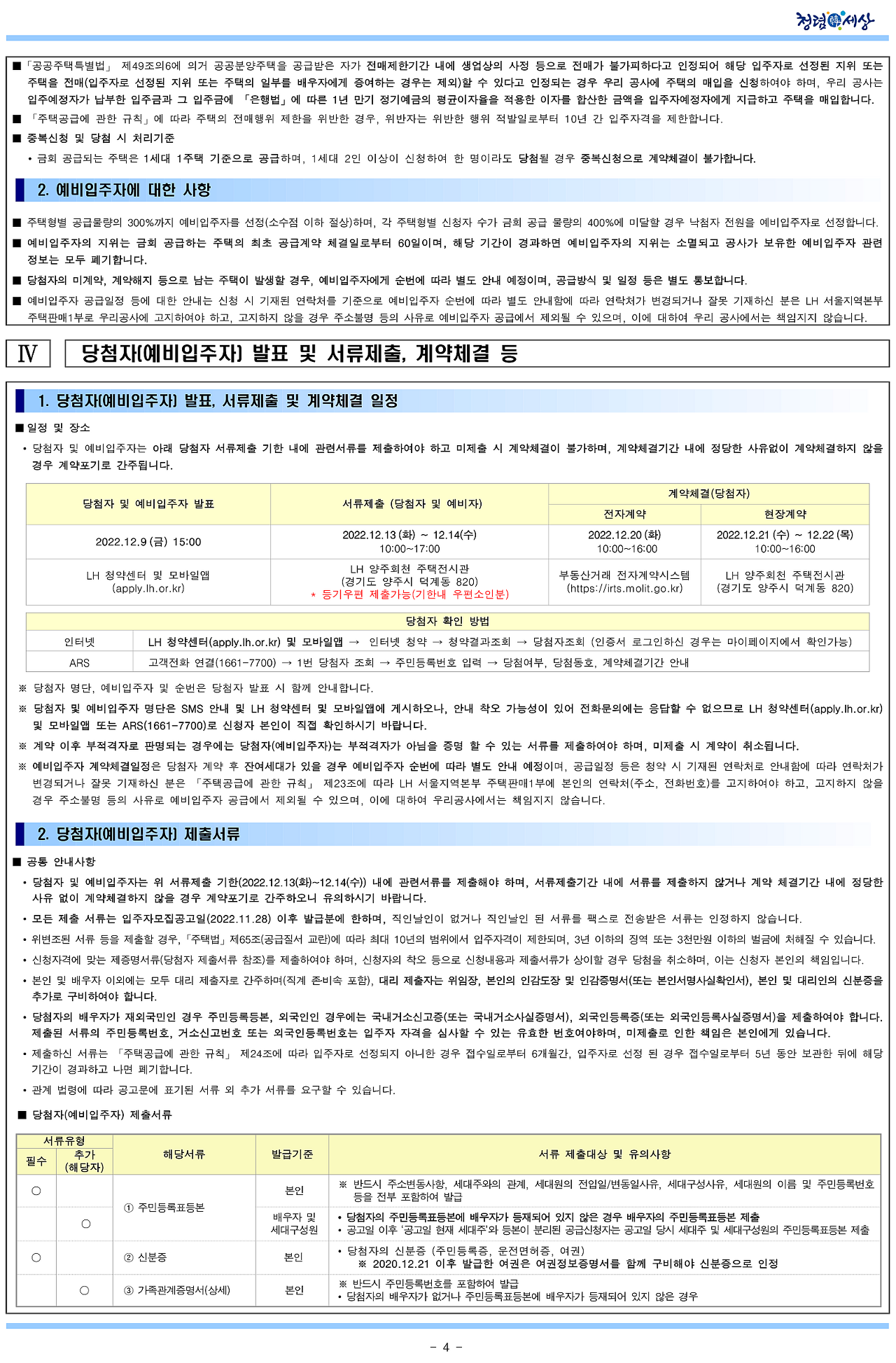 ■ 공고일(2022.11.28) 기준 양주옥정 A-4(1)블록 공공분양주택 특별공급·일반공급 기계약자 및 그 세대원(신혼부부 특별공급 예비신혼부부 자격 신청자의 경우 ‘혼인으로 구성될 세대’), 양주옥정 A-4(1)블록 공공분양주택 최초공고(2022.07.27 공고) 당첨 후 부적격으로 판정된 자(기간내 소명하지 아니한 자 포함)는 신청할 수 없으며, 계약체결 이후라도 적발 시 계약취소 됩니다.