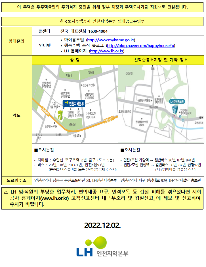 1. 건설위치 : 인천광역시 서구 이음3로 220 행복주택 1,942호