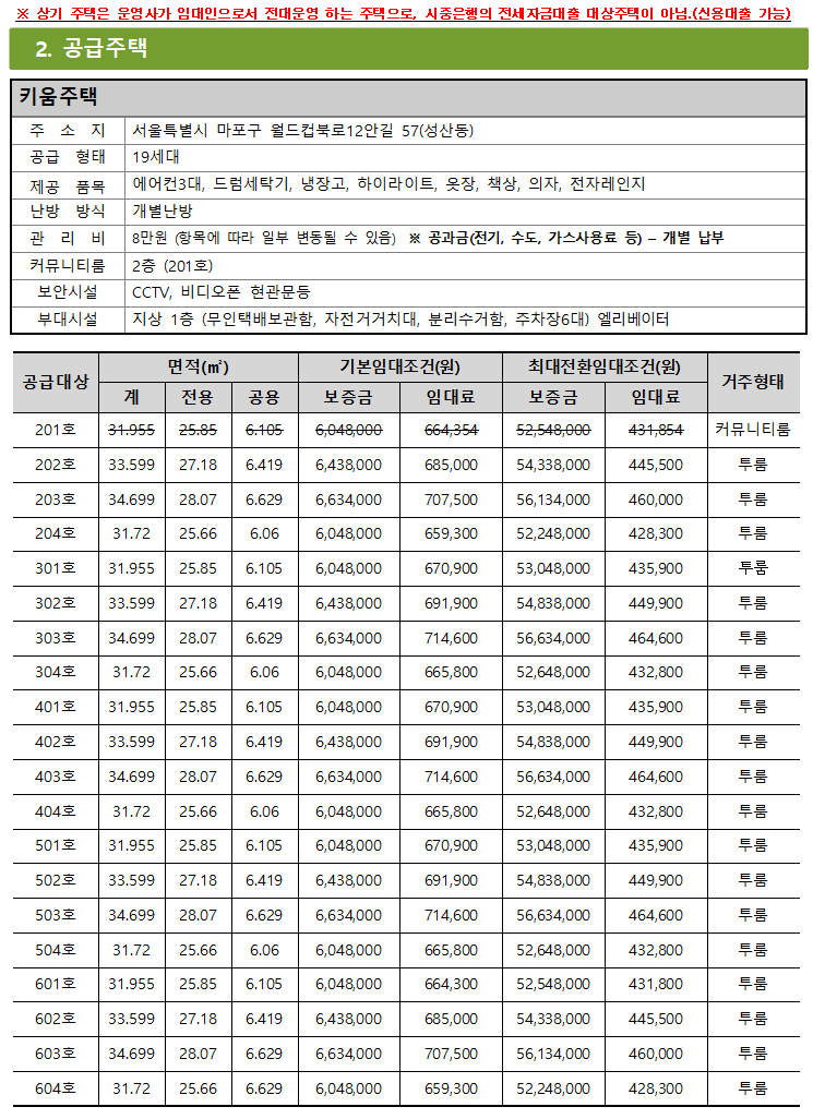 • 계약체결 이후 자산검증이 진행될 수 있으며, 자산검증 결과 부적격자로 판명되는 자는 3개월 내 퇴거 또는 인근 장기미임대주택으로 이주 중 선택할 수 있습니다.