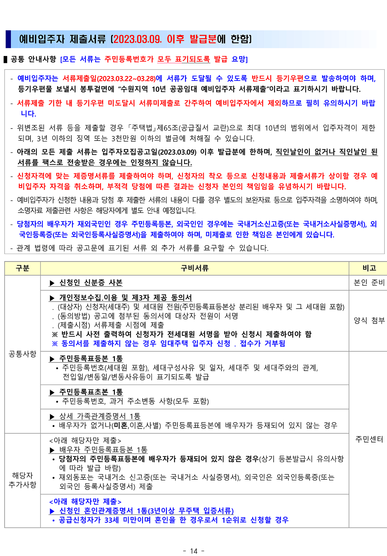 4. 예비당첨자 서류제출 : 2023.03.22(수)~2023.03.28(화) (등기우편 제출)