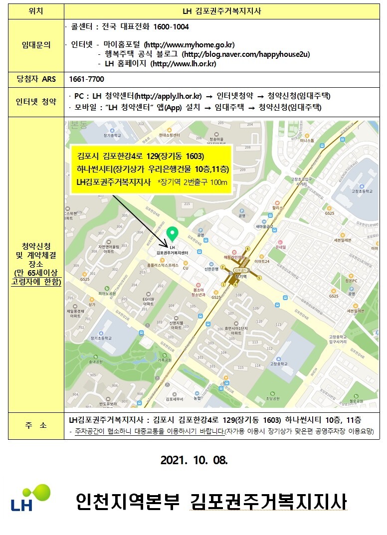 [인터넷(PC),모바일접수] '21.10.19.(화) 10:00 ~10.22.(금) 16:00 (인터넷(PC), 모바일접수는 시작일과 마감일을 제외 24시간 가능) [현장접수] *만 65세 이상의 고령자 중 인터넷 사용이 어려운 신청자에 한함 ‘21.10.22.(금) 10:00~16:00 (점심시간 12시~13시 제외) * 접수장소 : LH김포권주거복지지사 (김포시 김포한강4로 129, 하나썬시티 10층) |